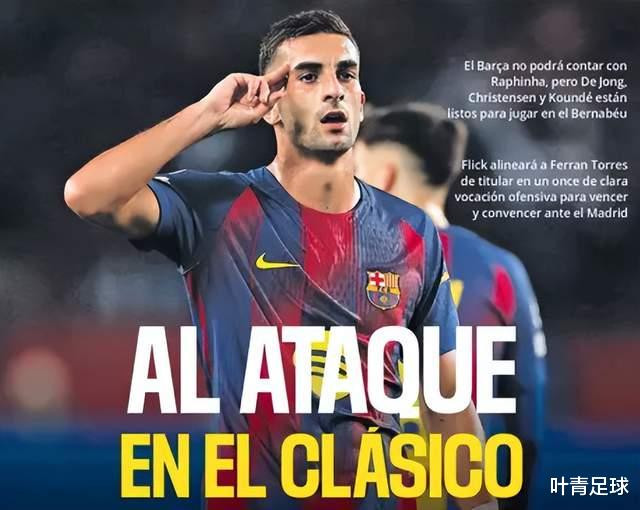 本周日23点15分,西甲第10轮打响国家德比,皇马主场迎战巴萨。10月25日,《每日体育报》头版头条报道指出,巴萨主帅弗里克已经敲定前场三叉戟,25岁的费兰-托雷斯出任中锋。费兰一共3次洞穿皇马大门,这次国家德比,25岁的巴萨中锋,期待4杀皇马。